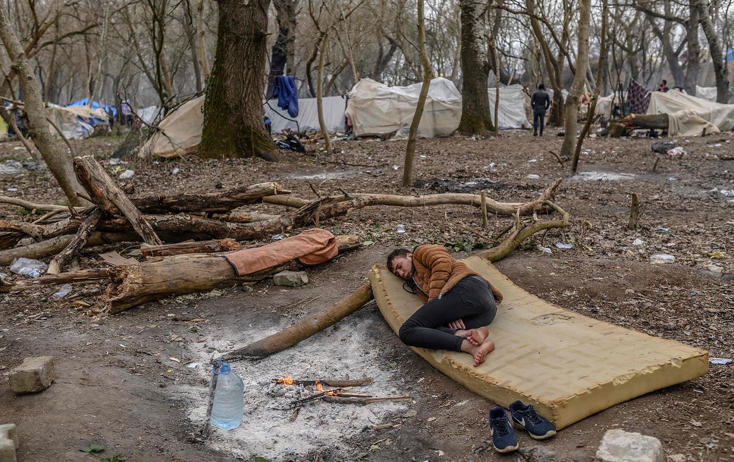 A migrant sleeps near a bonfire in the forest in the buffer zone at the Turkey-Greece border, near the Pazarkule crossing gate in Edirne, Turkey, March 5, 2020. Photo: Bulent Kilic / AFP