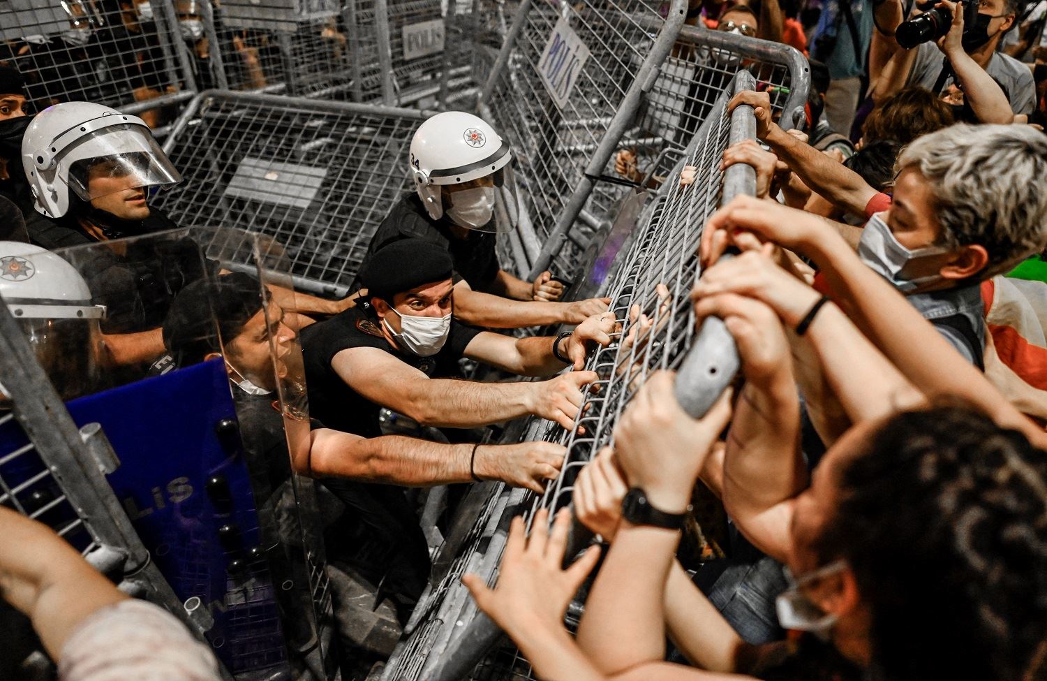 Women demonstrators clash with Turkish police as they protest against Turkey's decision to withdraw from the Istanbul Convention, in Istanbul, on July 1, 2021. Photo: Bulent Kilic/AFP
