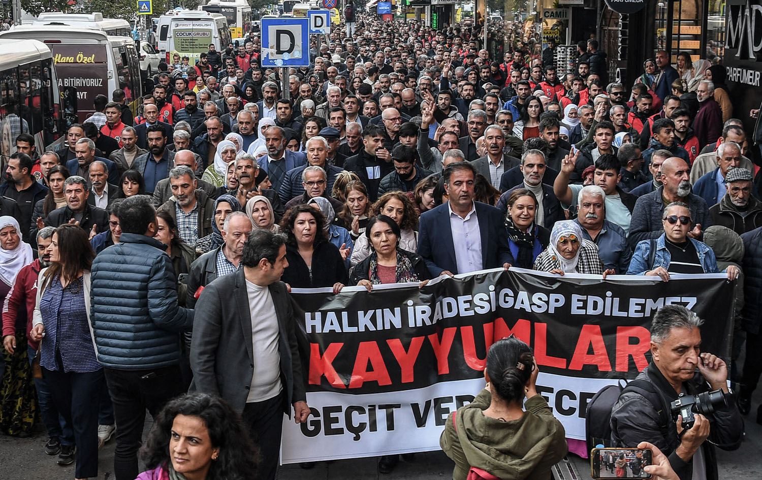 Protesters take part in a march against trustees holding a banner which reads as "The will of the people cannot be usurped. We will not let the trutees" during a demonstration in Diyarbakir, on November 4, 2024. Photo: Ilyas AKENGIN / AFP