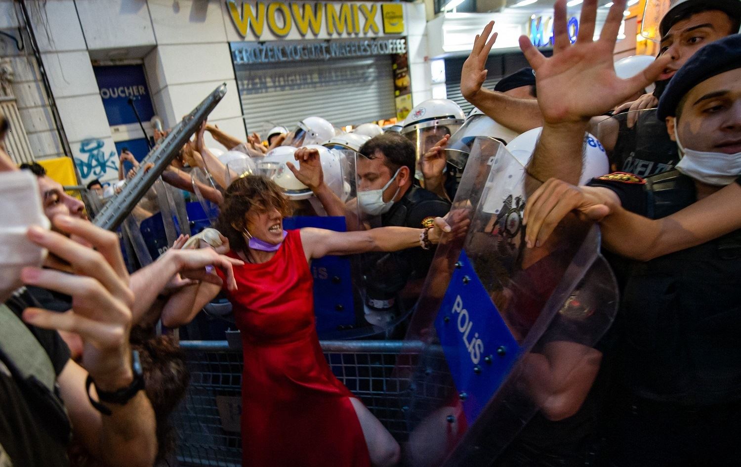 Women demonstrators clash with Turkish police as they protest against Turkey's decision to withdraw from the Istanbul Convention, in Istanbul on July 1, 2021. Photo: Yasin Akgul/AFP