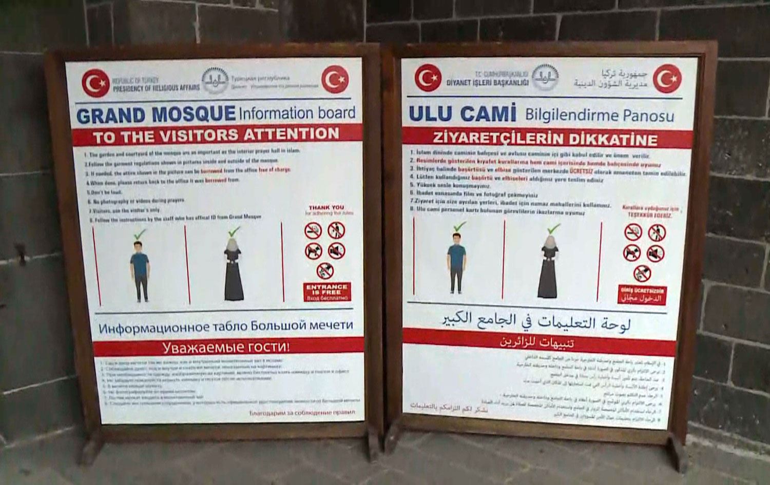 The board, prepared by the country's department of religious affairs, informs the visitors about the rules of the mosque in English, Turkish, Russian and Arabic languages while the majority of the population is Kurdish. This has angered many Kurds who doubted any Russian tourists ever visited the mosque.