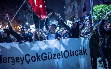 “AKP is a thief and the election body their accomplice,” read a sign carried by a protester, referring to the ruling Justice and Development Party of President Recep Tayyip Erdogan. “Hope is in the streets,” read another placard. “Nobody can stop a united nation,” a third proclaimed.