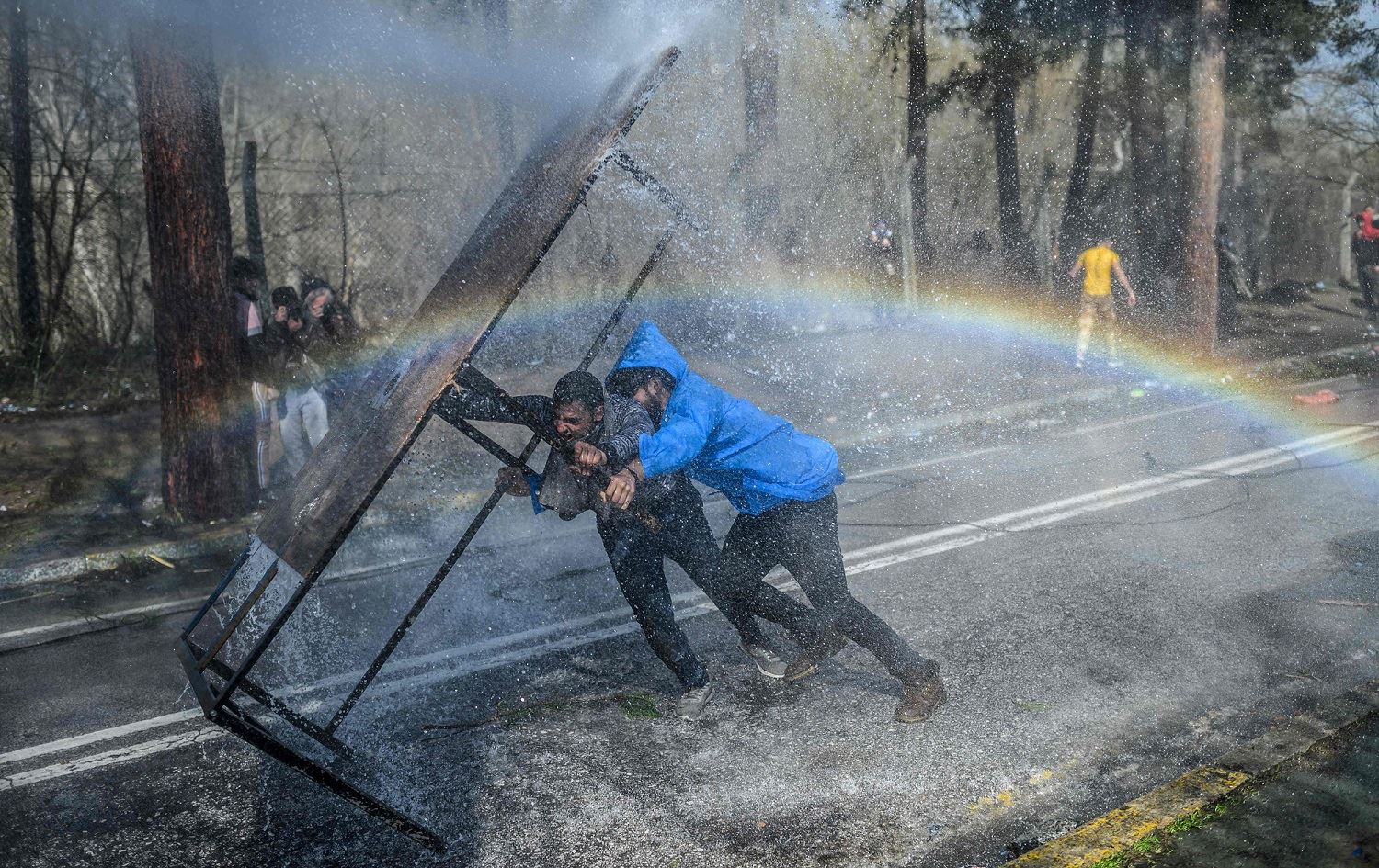 Migrants take cover behind a wooden board as Greek police uses water cannons to block them trying to break fences in the Turkey-Greece border province of Edirne, March 7, 2020. Photo: Bulent Kilic / AFP