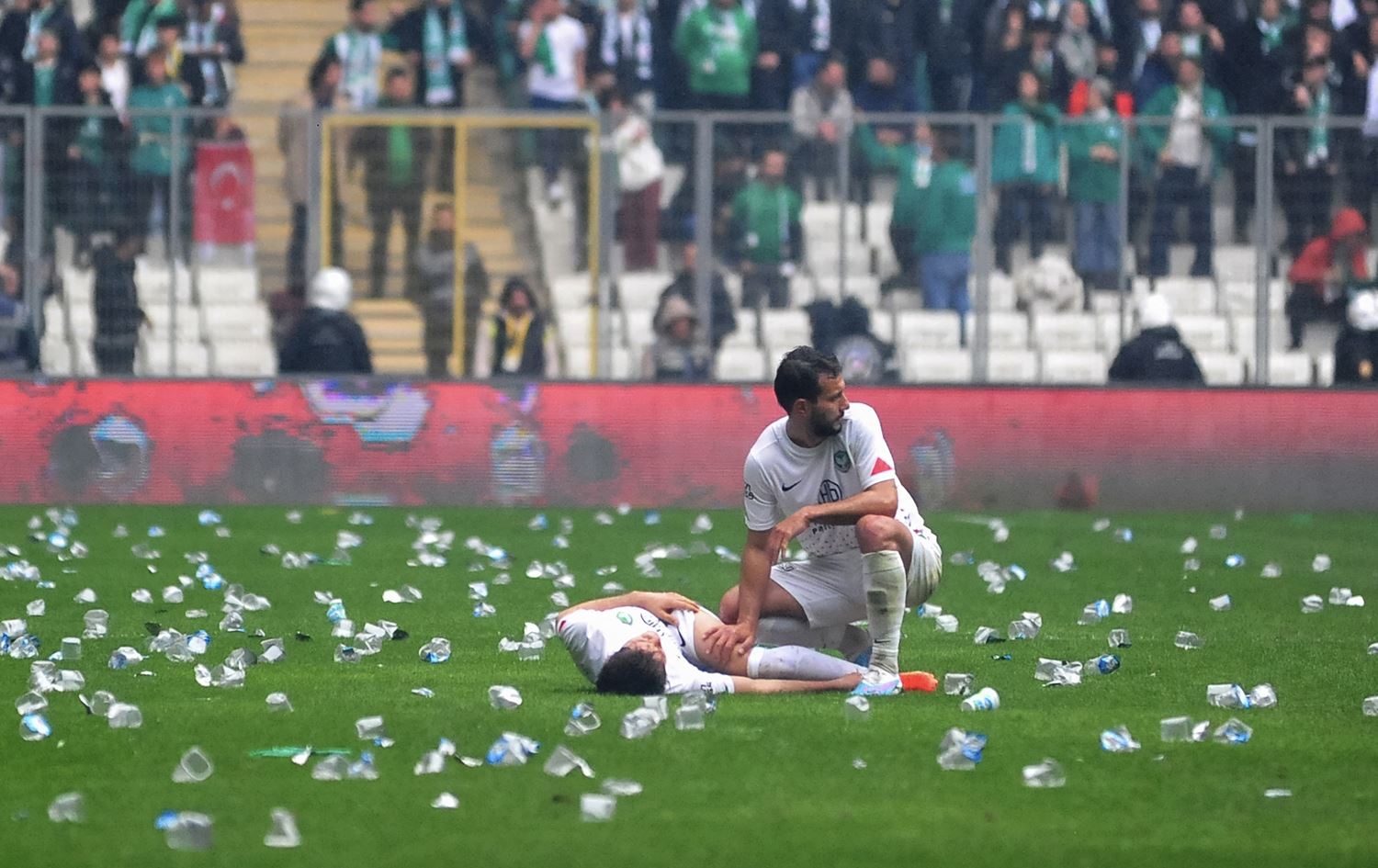 A player of Kurdish Amedspor lies injured on the field after violent incidents targeting the Kurdish team occurred and items were thrown onto the pitch during a football match between Turkish team Bursaspor and Kurdish team Amedspor, in Bursa, Turkey, on March 5, 2023. Photo: AFP / DHA (DEMIROREN NEWS AGENCY)