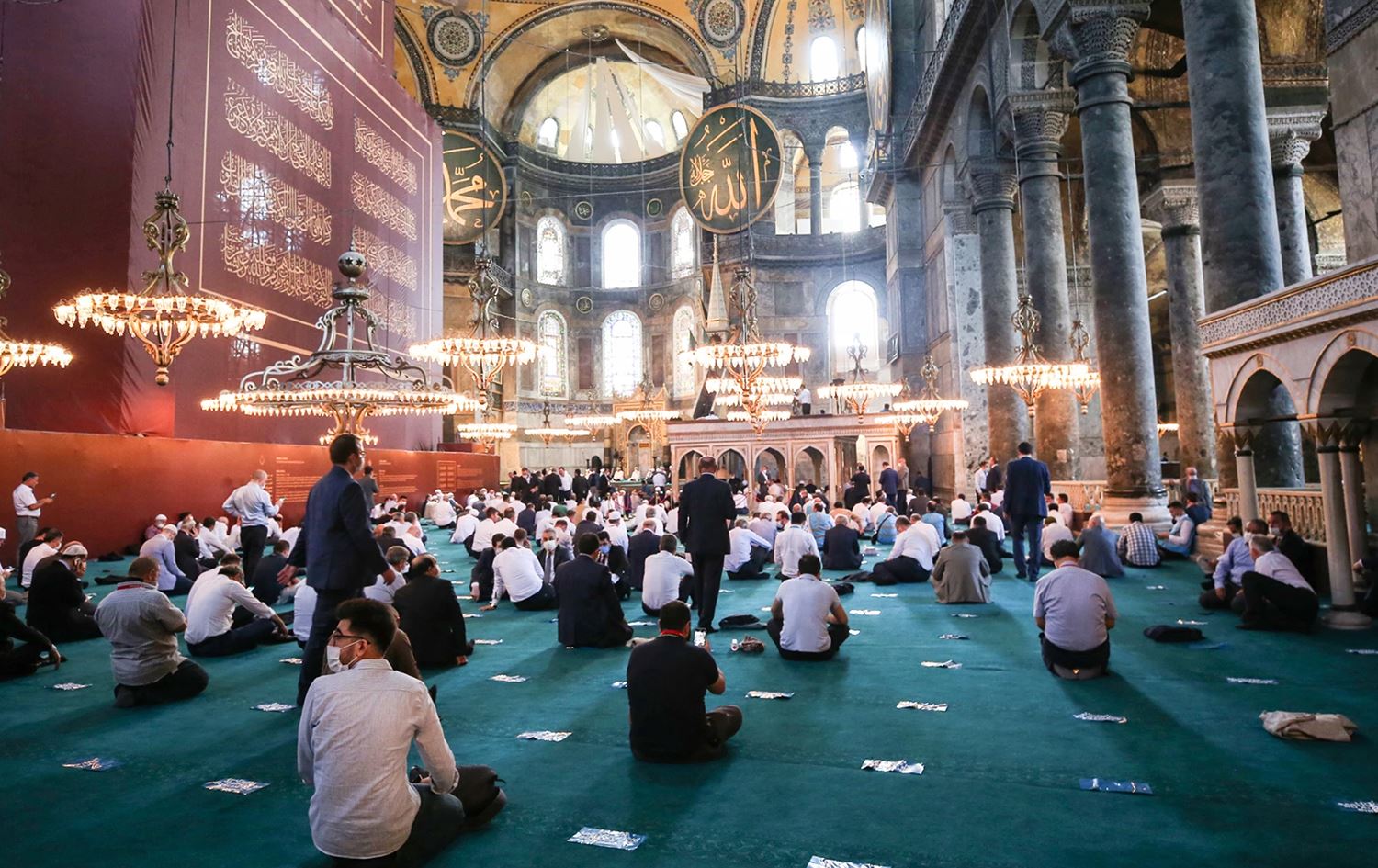 People gather to perform Friday Prayer in the Hagia Sophia for the first time after 86 years in Istanbul, Turkey. Photo: Esra Bilgin/Anadolu Agency