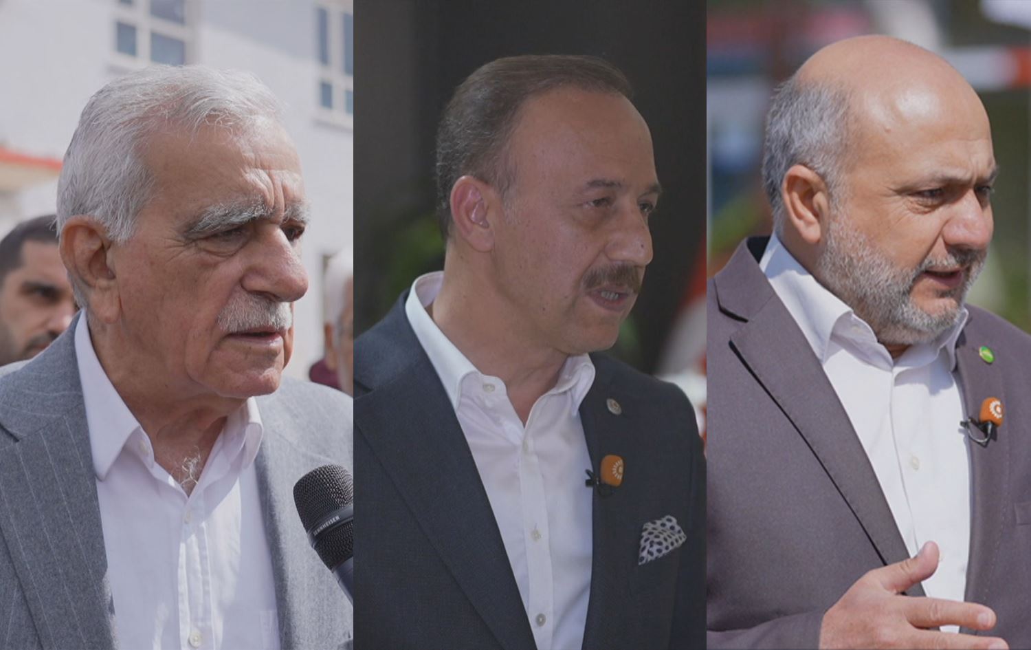 From left: Ahmet Turk, Abdullah Erin, and Ismail Cevik speaking to Rudaw in Mardin, Turkey on March 12, 2024. Photos: Rudaw/screengrab