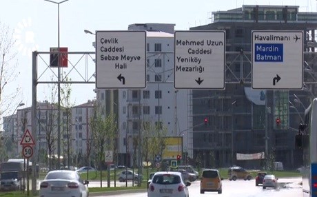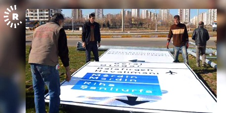 This bilingual sign was replaced with a Turkish-only sign on the main road to the airport on Amed. Photo: Rudaw TV