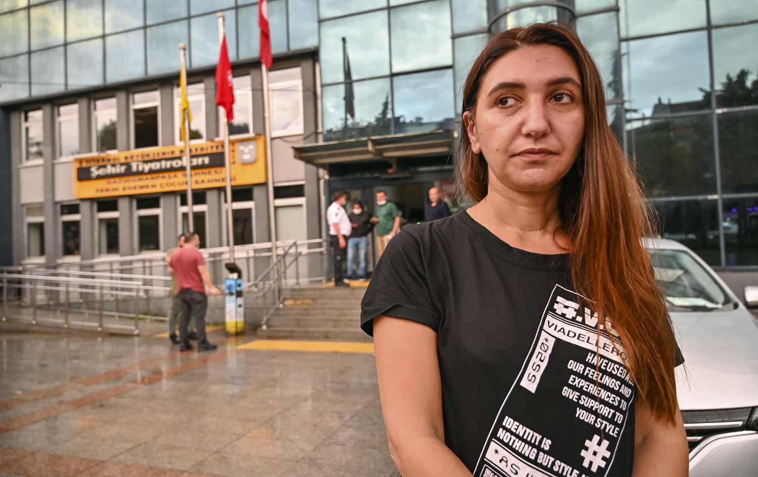 Actress Ruges Kirici answers media in front of Istanbul metropolitan municipality theater building after Turkish authorities have banned a Kurdish-language play at Gaziosmanpasa district in Istanbul on October 13, 2020. Photo: Ozan Kose / AFP