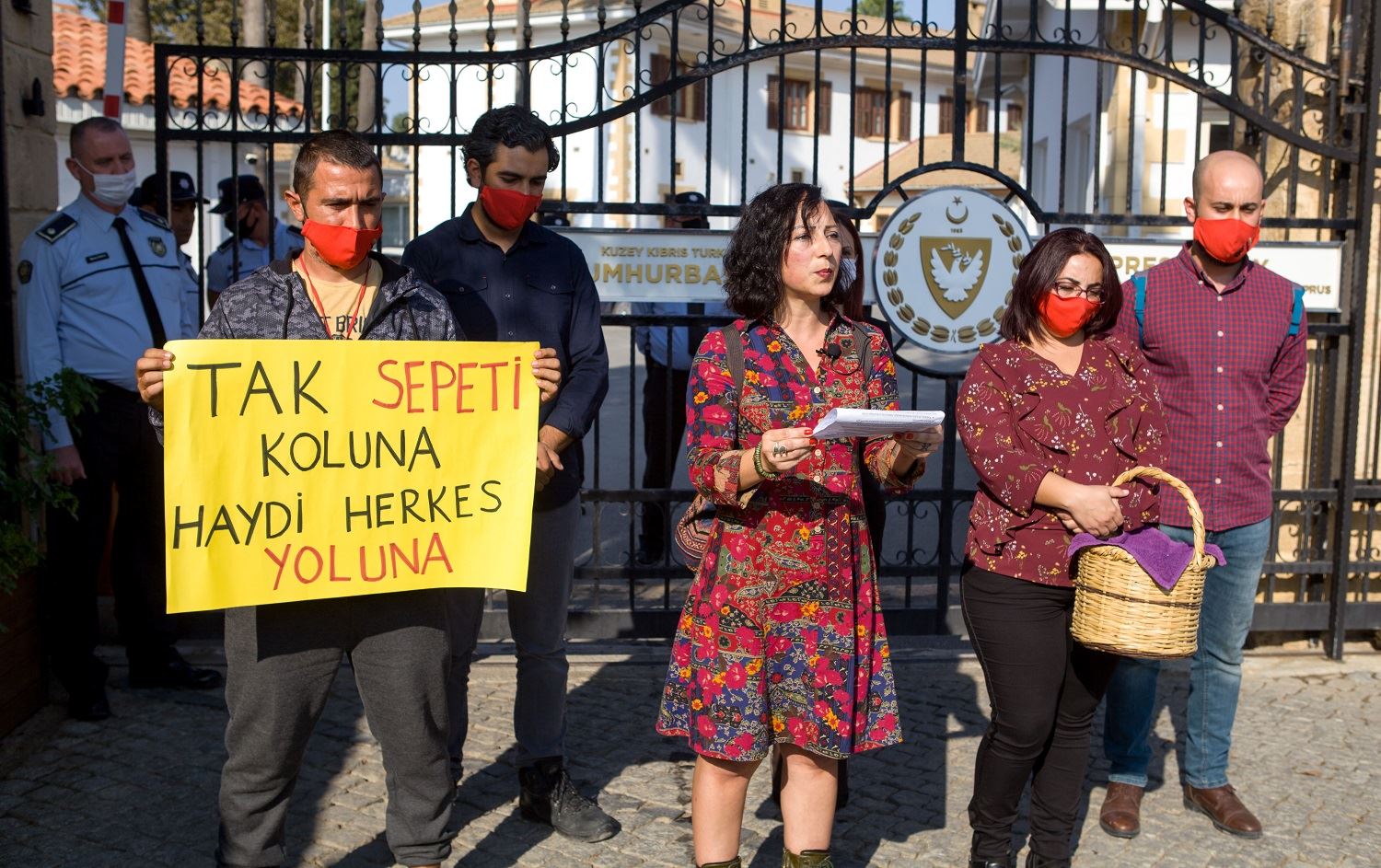 Protesters gather around a picnic basket in the northern part of Nicosia, the capital of the self-proclaimed Turkish Republic of Northern Cyprus (TRNC), during a demonstration on November 13, 2020 against the "interference" of Ankara, days before Turkish President Recep Tayyip Erdogan is to visit. Photo: Birol Bebek / AFP