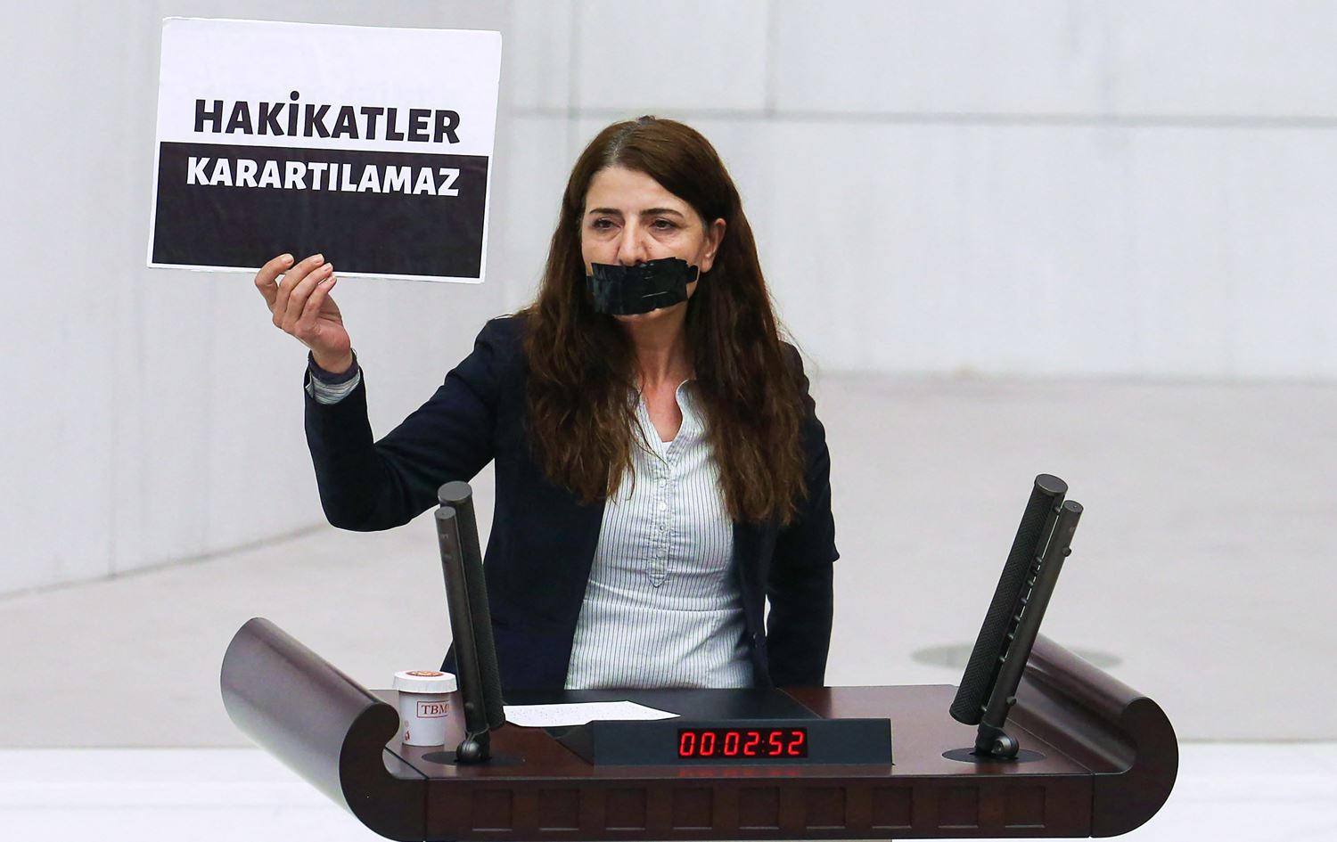Peoples' Democratic Party's Zuleyha Gulum holds a banner "Truths cannot be obscured" as she stands with a covered mouth at the Turkish Grand National Assembly in Ankara on October 13, 2022, Photo: Adem Altan/AFP