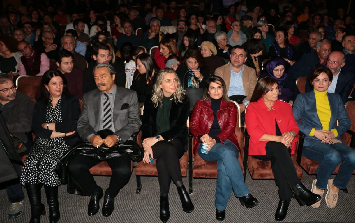 From left to right: Former HDP MP Sirri Sureyya Onder, HDP co-chair Pelvin Buldan, artist Kadir Inanir, Dilek Imamoglu, Basak Demirtas, Selvi Kilıcdaroglu (wife of CHP leader Kemal Kılıcdaroglu) and Canan Kaftancioglu attend the play adaptation of Devran. Photo via HDP on Twitter