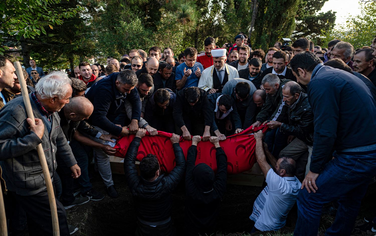 Members of the public react during the burial of Ridvan Acet, one of the miners who died after an explosion in a coal mine in Amasra, as part of his funeral ceremony in Turkey's Bartin Province, on October 15, 2022. Photo: Yasin Akgul/AFP