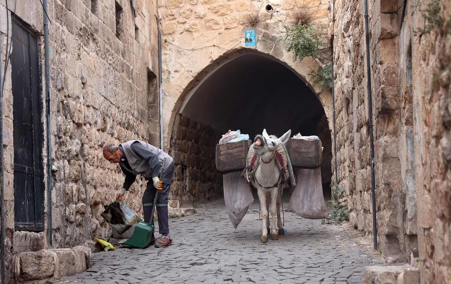 A municipal employee guiding a donkey collects garbage in the old city of Mardin, southeastern Turkey, on October 18, 2021. Photo: Adem Altan/AFP