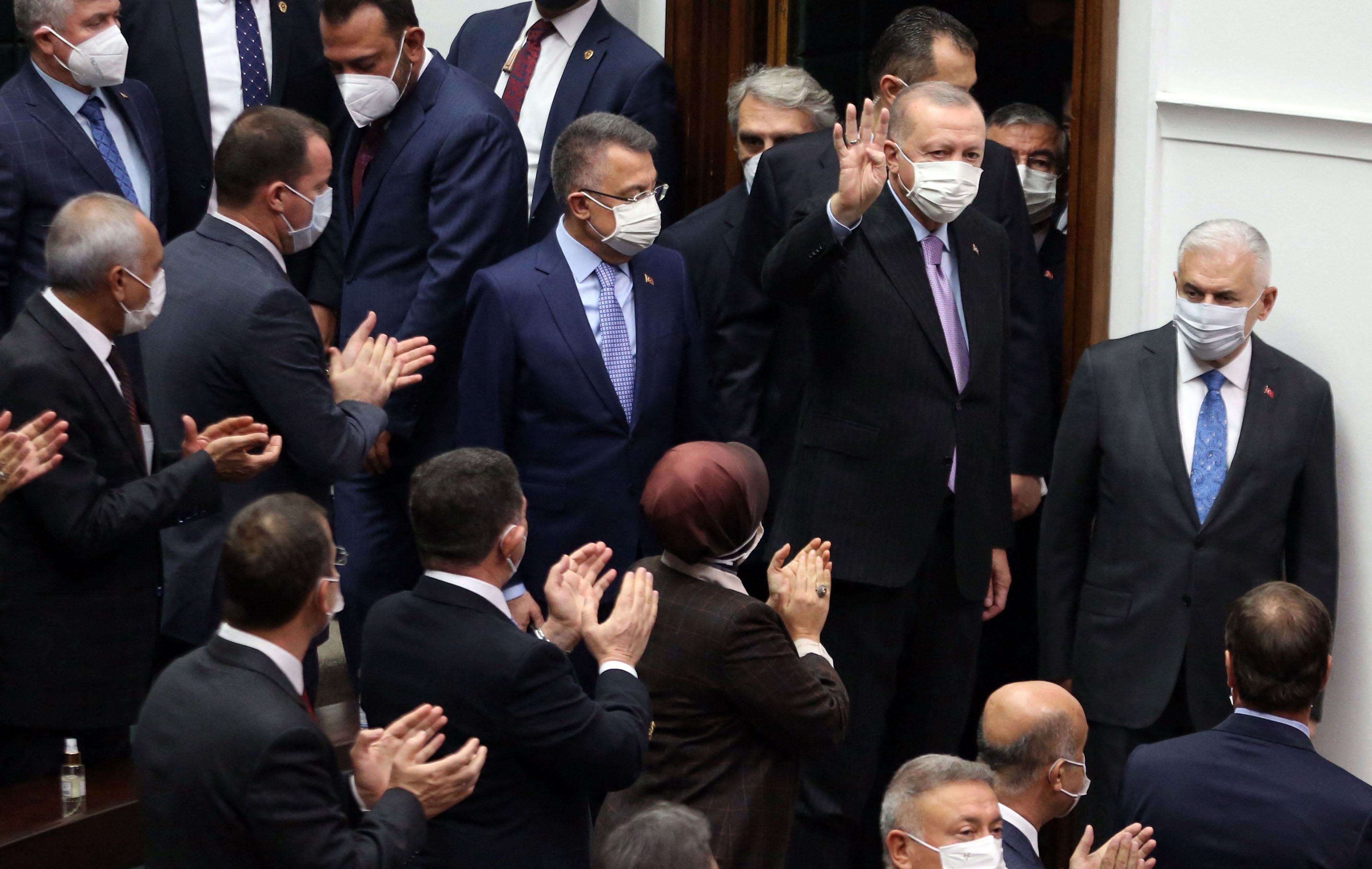 Turkish President Recep Tayyip Erdogan (central row, 2nd row) is applauded as he arrives at the Turkish Grand National Assembly in Ankara, on November 17, 2021. Photo: Adem ALTAN / AFP