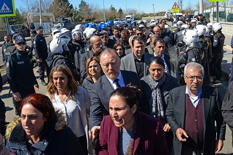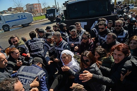 Turkish anti-riot police block members of the pro-Kurdish Peoples' Democratic Party (HDP) during the funeral of Kurdish activist Zulkuf Gezen in the Turkish city of Diyarbakir, March 18, 2019. Photo: Ilyas Akengin / AFP