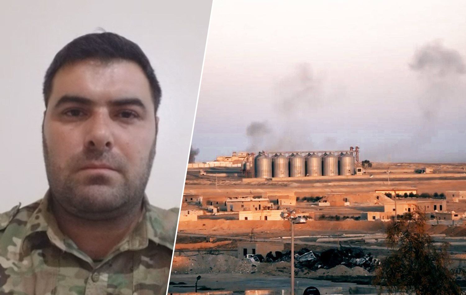 Composite photo: Left: Gabriel Kino, SDF spokesperson, speaks to Rudaw TV. Photo: Rudaw; Right: Turkish bombardment in Ain Issa on December 18, 2020. Photo: ANHA
