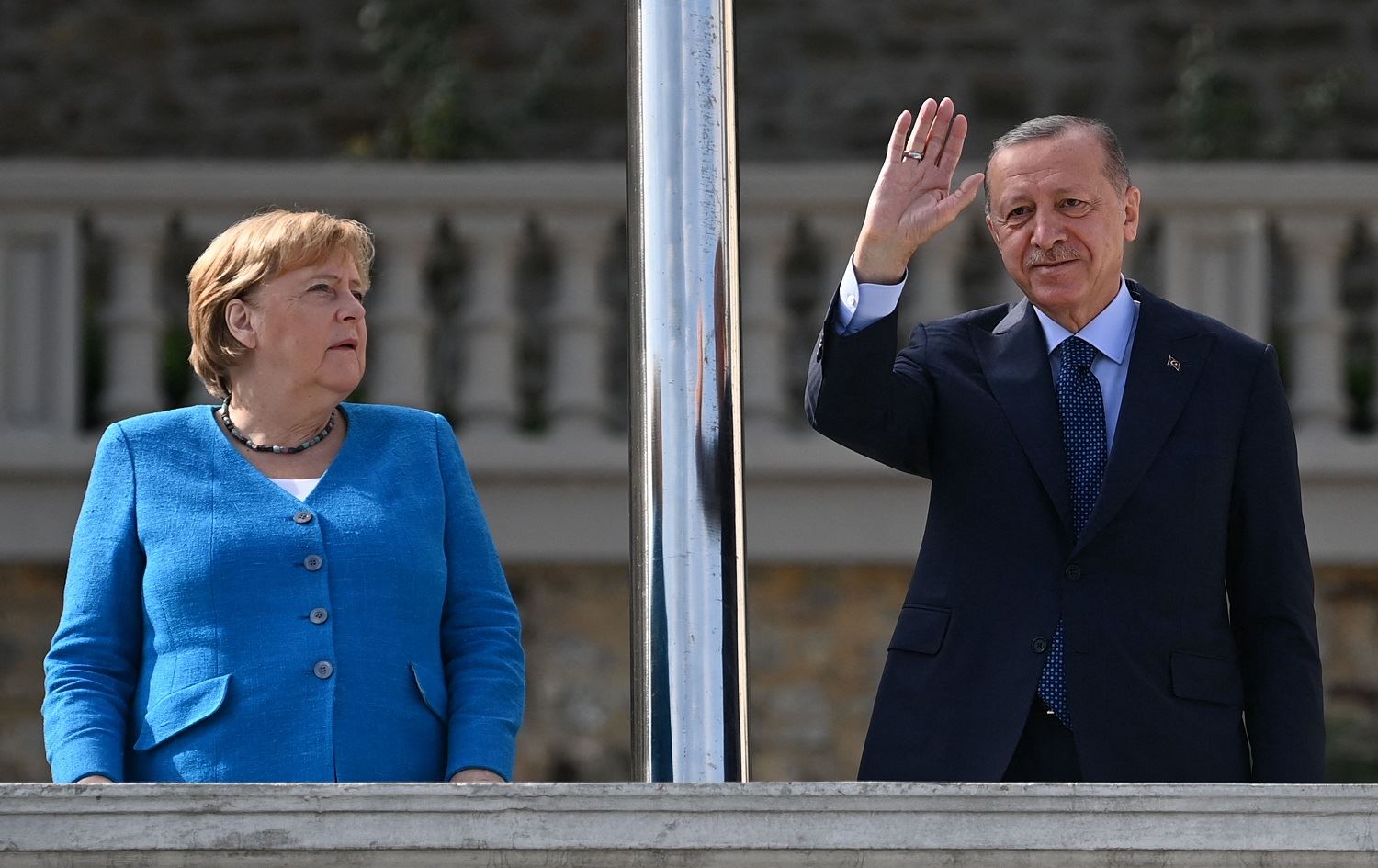 Turkish President Recep Tayyip Erdogan (R) waves as German Chancellor Angela Merkel (L) looks on as they pose in Istanbul on October 16, 2021. Photo: Ozan Kose/AFP