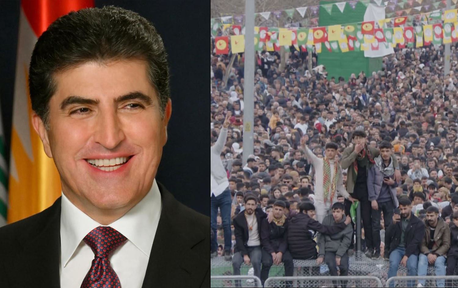 A file photo of Kurdistan Region President Nechirvan Barzani (left) and a scene from Newroz celebrations in Amed on March 21, 2025 (right). Graphic: Rudaw