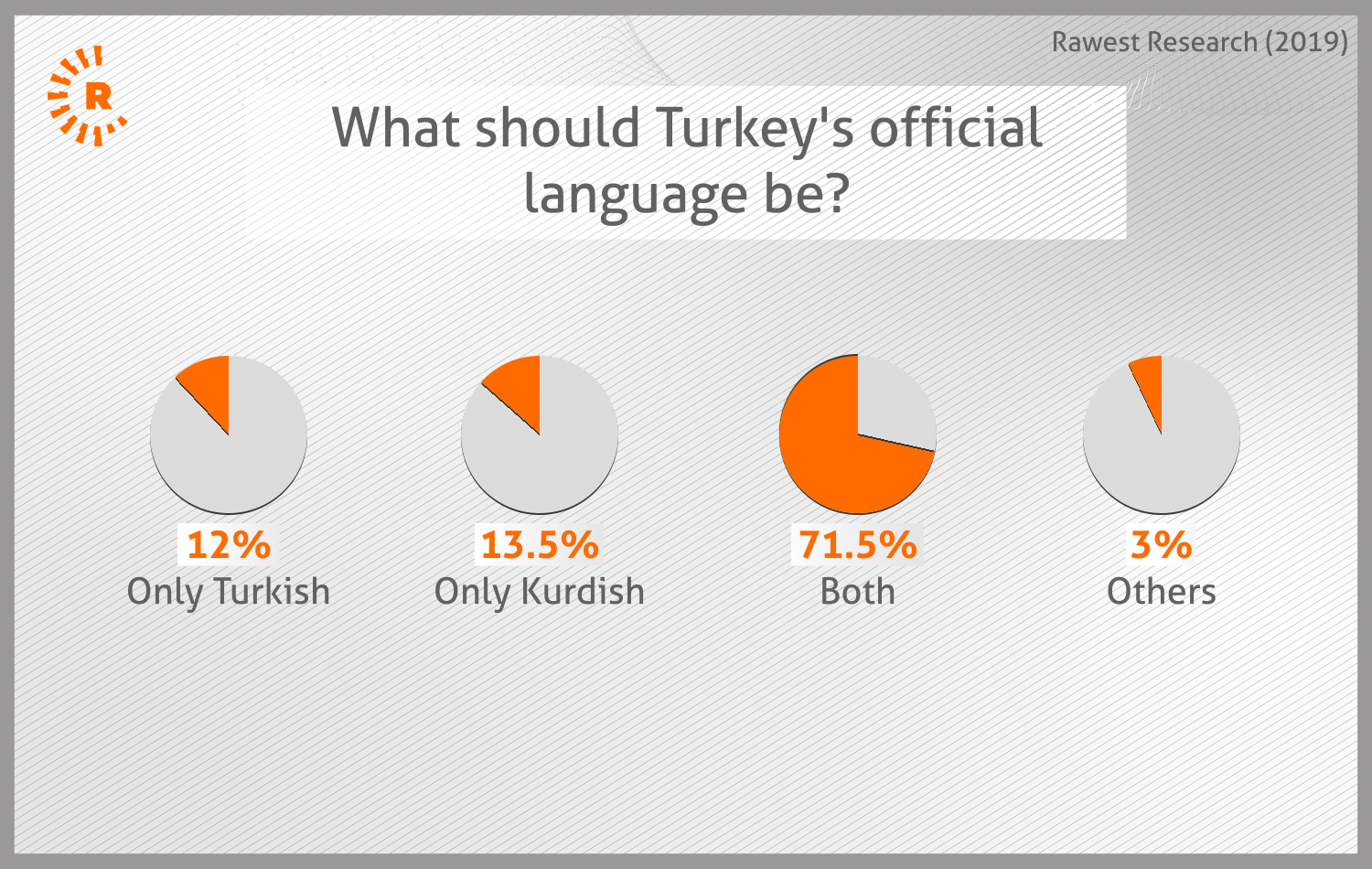 Rawest, a Kurdish research center in Diyarbakir, conducted a survey in several Kurdish areas of southeastern Turkey in September 2019, to scope out the extent of Kurdish proficiency among the country’s 18-30 year olds. Of the 600 young Kurds surveyed, only 18 percent said they could speak, read and write Kurdish. Less than half of respondents, 44 percent, said they were able to speak their mother tongue. When asked what the official language of Turkey should be, 71.5 percent of participants said it should be both Turkish and Kurdish.