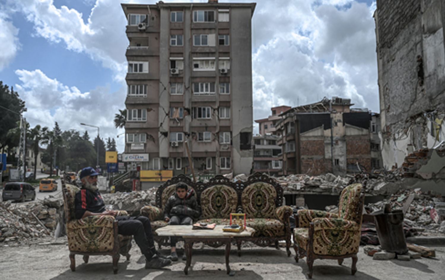 A man sits with his son amid the rubble of collapsed buildings, two months after a 7.8-magnitude jolt and its aftershocks wiped out swathes of Turkey's mountainous southeast, in Antakya on April 5, 2023. OZAN KOSE / AFP