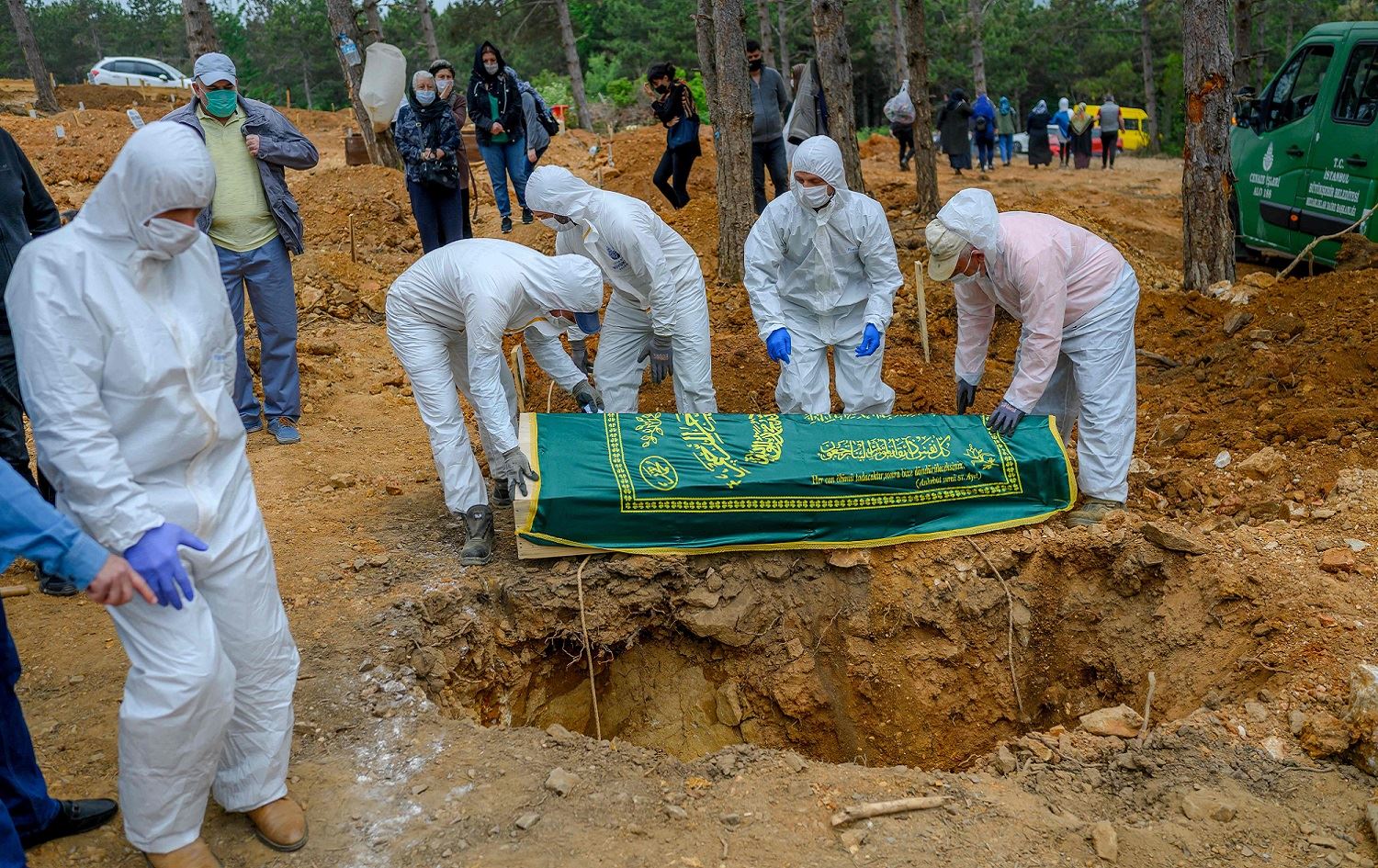 Gathered around the grave, Ucukcu and his close family – all wearing protective masks and standing a few paces from each other – say prayers after the coffin is buried.