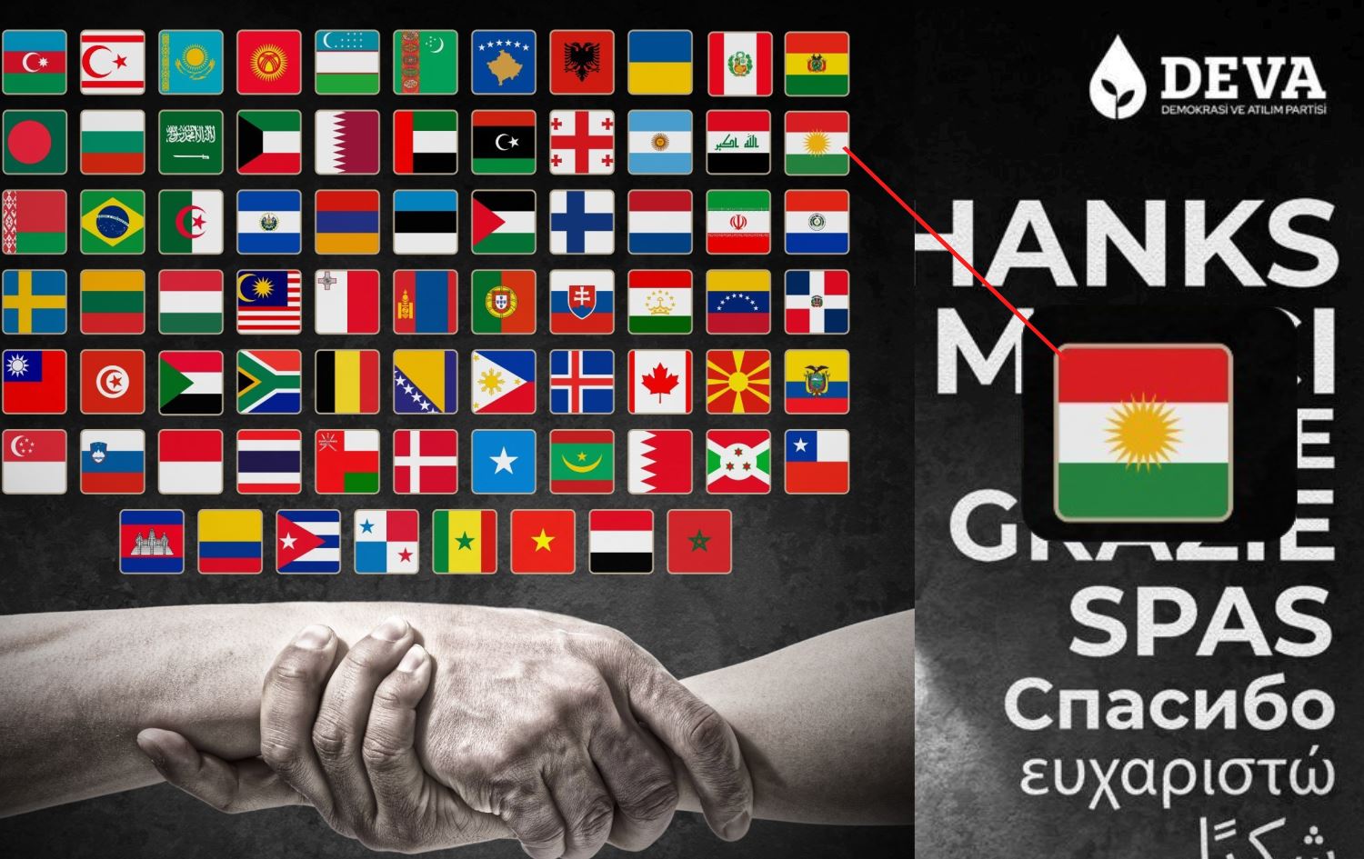 Graphic shared by Ali Babacan leader of DEVA party on Twitter earlier this week, showing flags of nations which helped Turkey in the quake response, Kurdistan Region.