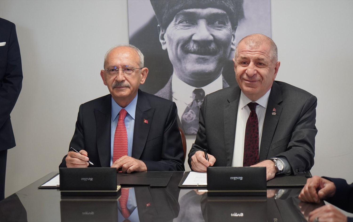 Presidential candidate Kemal Kilicdaroglu (left) and Victory Party Leader Umit Ozdag (right) signing a seven-point protocol in Ankara on May 24, 2023. Photo: Victory Party