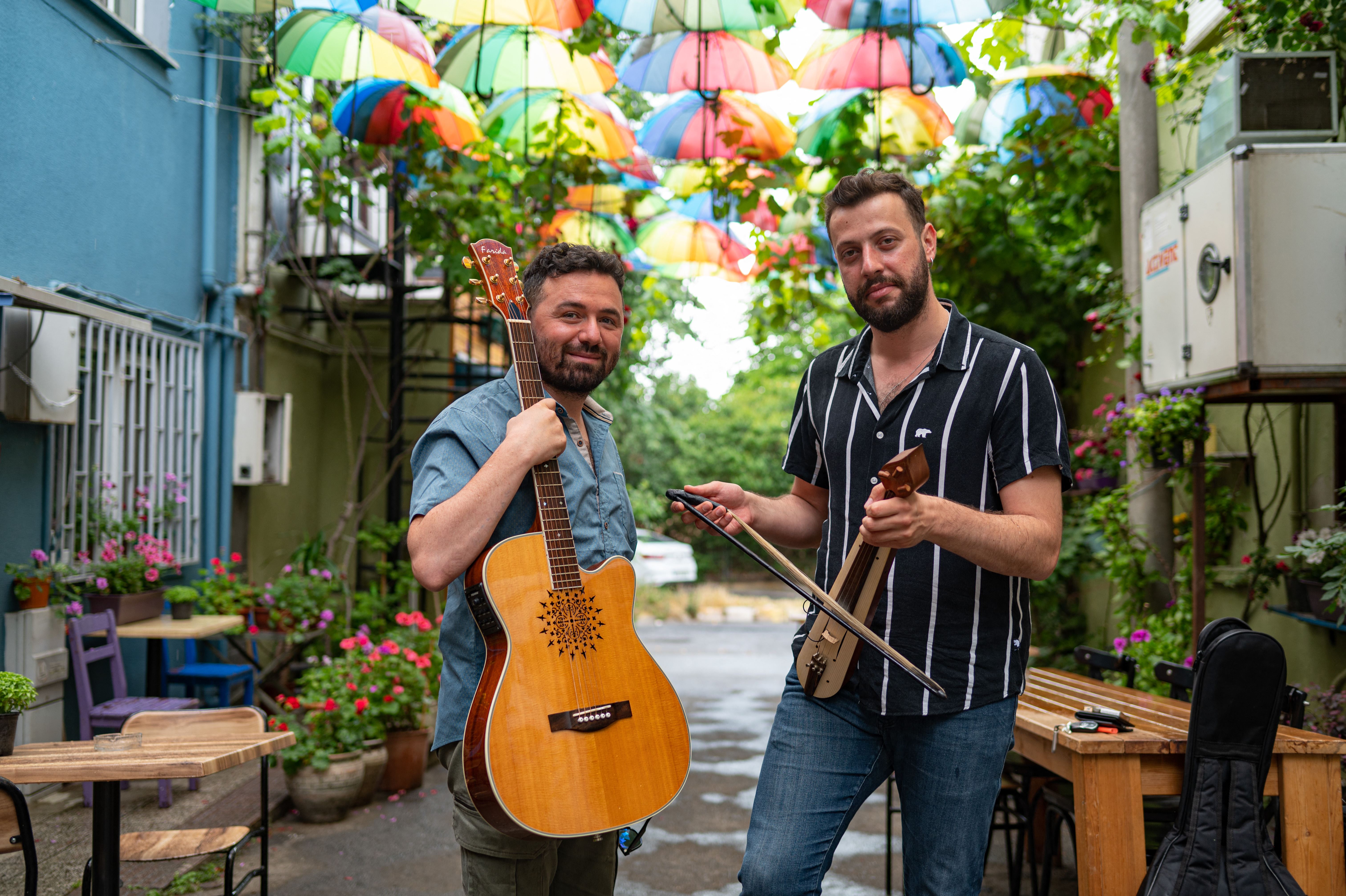 Apolas Lermi (L), poses with fellow musician Eren Demir, in Istanbul on June 7, 2022. Photo: AFP