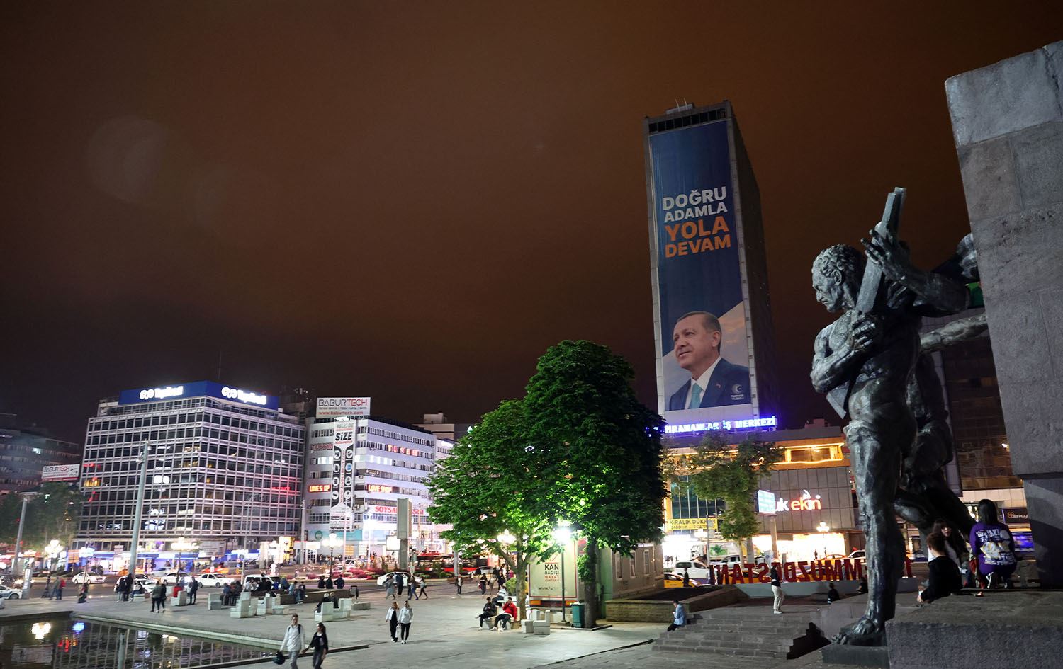 Pedestrians walk underneath a poster showing a portrait of Turkey's President Recep Tayyip Erdogan at Guven Park Monument in Kizilay Square, Ankara on May 27, 2023, on the eve of a runoff in Turkey's presidential election. Photo: Adem Altan/AFP