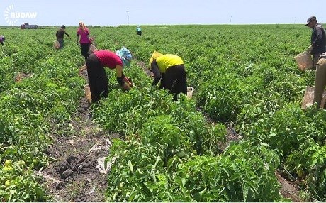 The families, including children, are now working on farmlands, harvesting tomatoes.