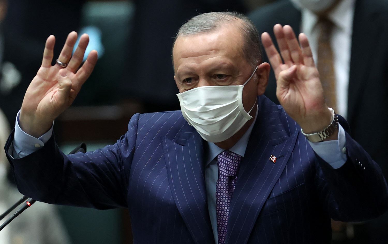 Turkish President and leader of the Justice and Development Party (AK Party) Recep Tayyip Erdogan gestures as he attends the parliamentary group meeting of AKP in Ankara on October 27, 2021. Photo: Adem Altan/AFP