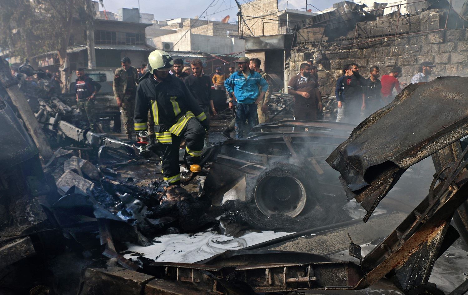 A handout picture released by the Syrian Civil Defence rescue workers shows the scene of the truck bombing in Afrin on April 28, 2020. Photo: AFP/HO/Syrian Civil Defence