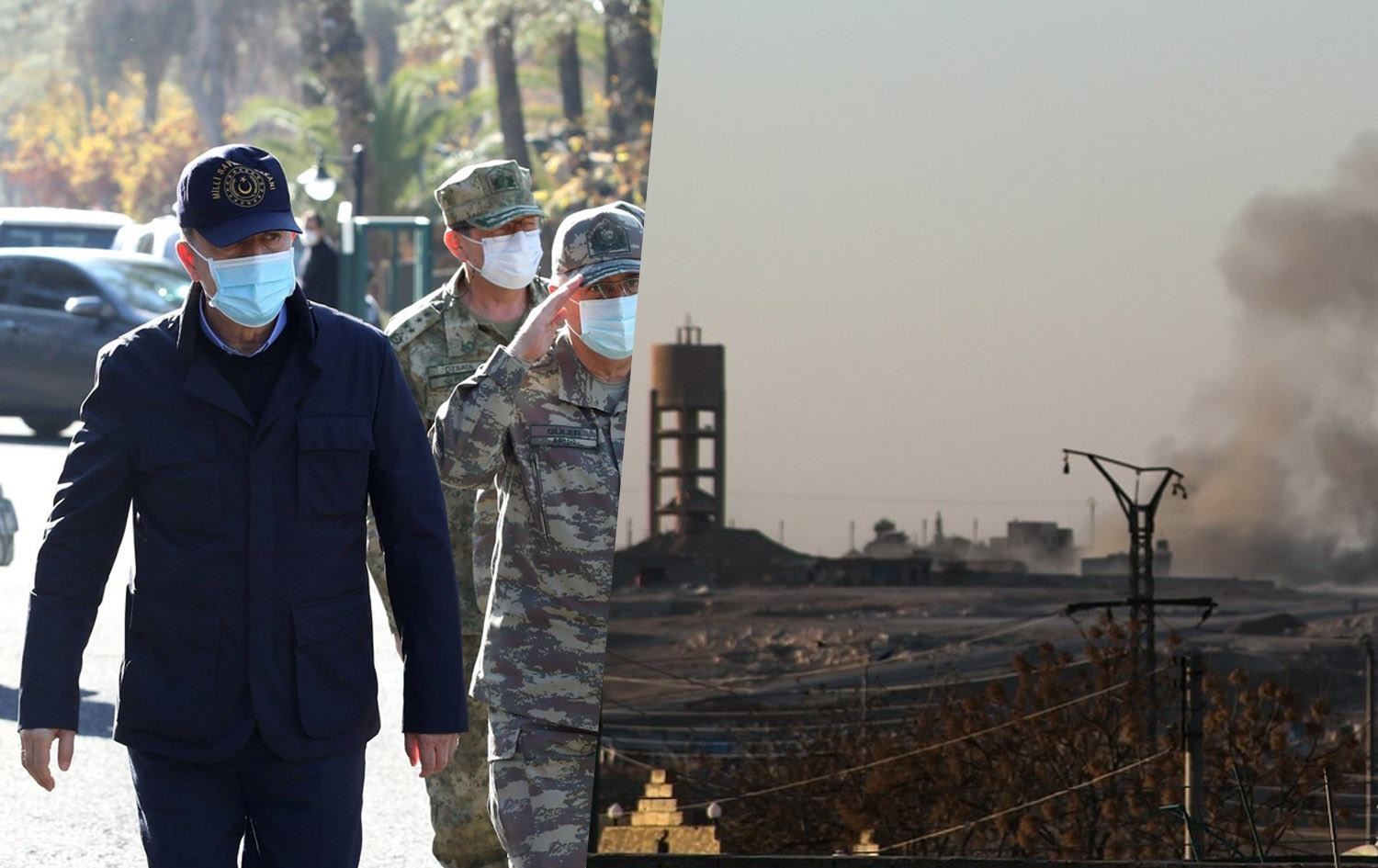 Turkish defense minister [left] and the Wednesday bombardment of Ain Issa. Photos: Turkish defense ministry and ANHA