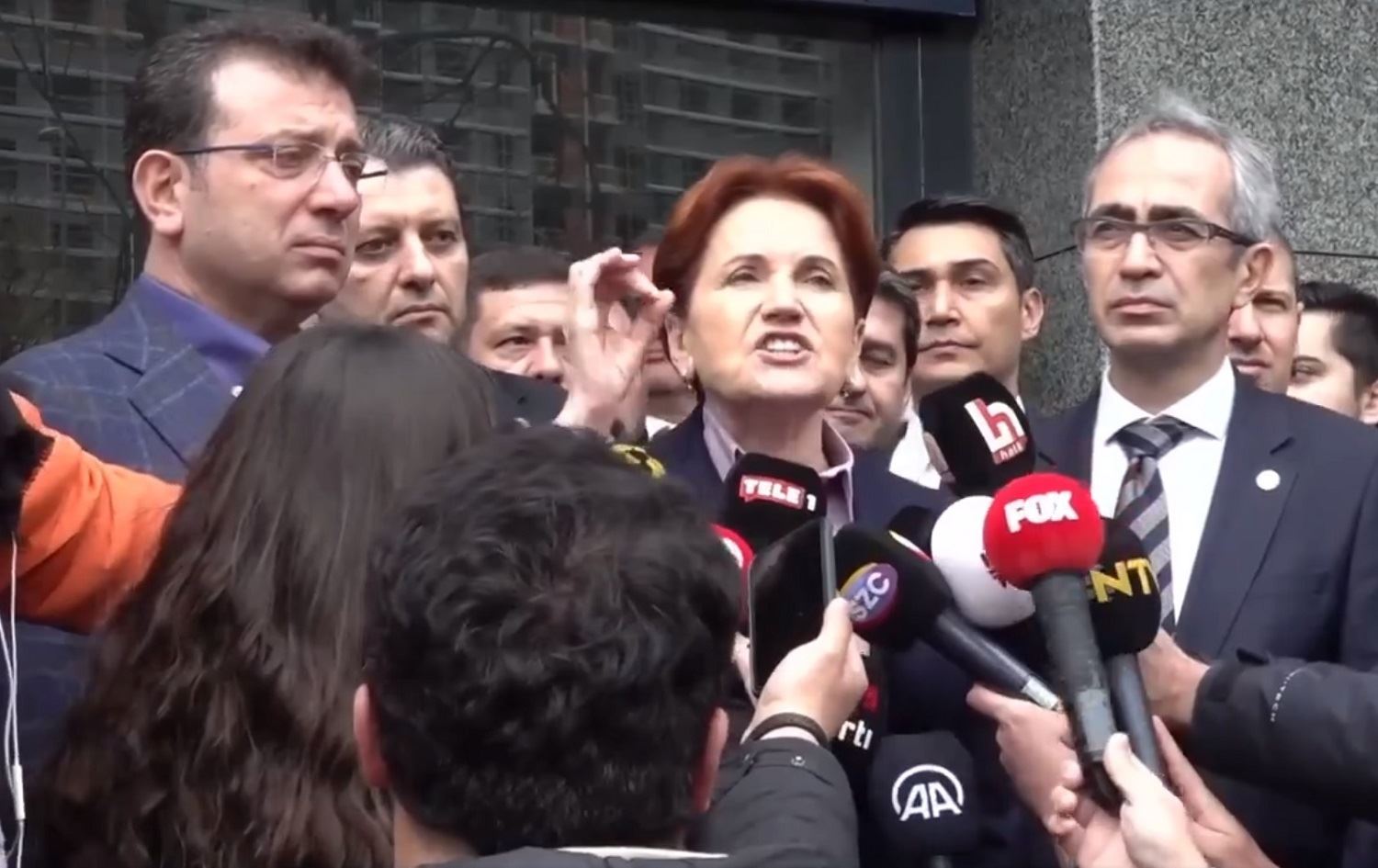 IYI party leader Meral Aksener (centre) speaks to reporters outside her party office in Istanbul on March 31, 2023. She is flanked by Istanbul Mayor Ekrem Imamoglu (left) and head of IYI Istanbul office Coskun Yildirim (right). Photo: Meral Aksener Twitter/screen grab