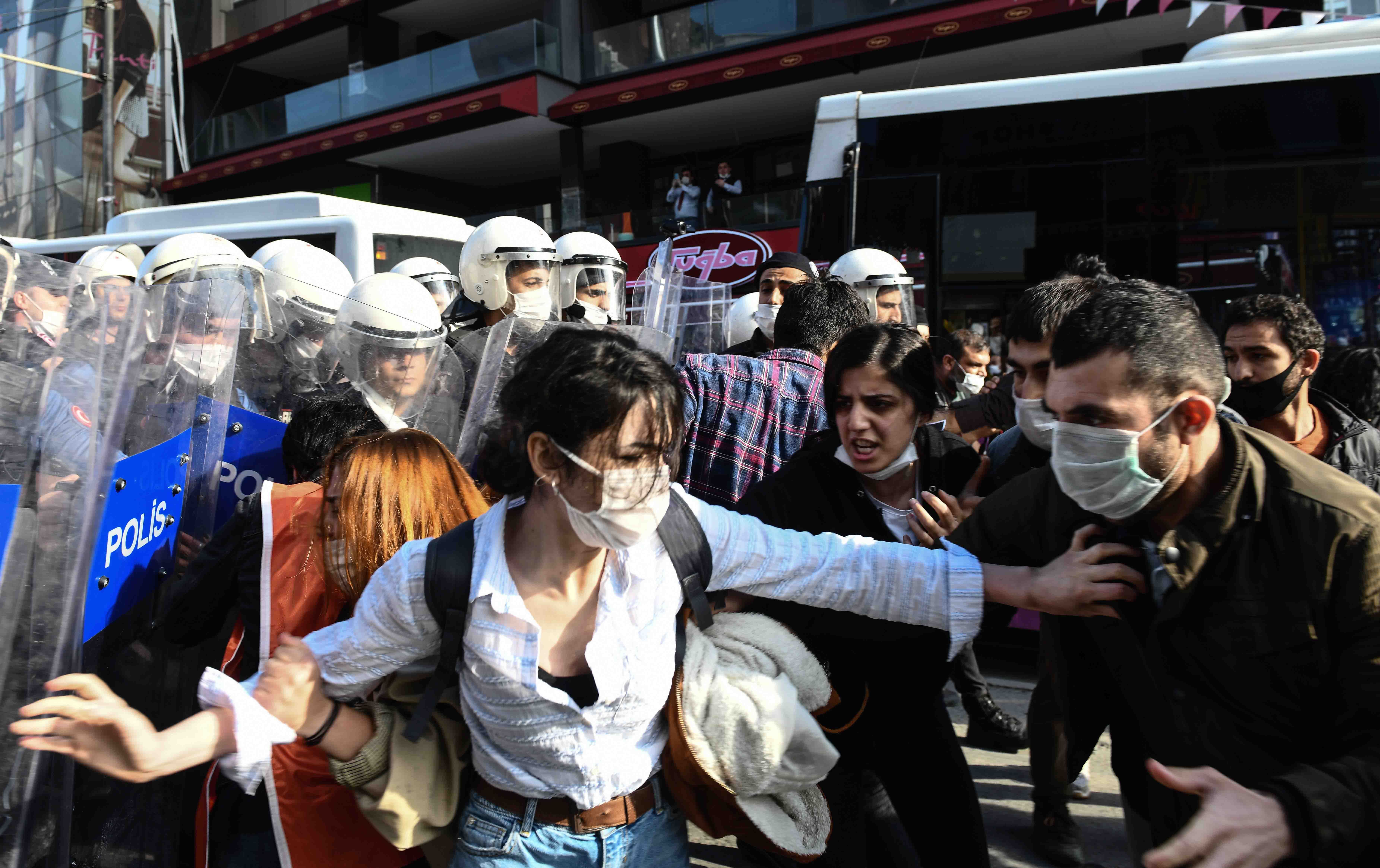 Turkish police officers, in riot gear, and wearing face masks scuffle with protesters during a demonstration in Istanbul. Photo: Omer Kuscu/AP