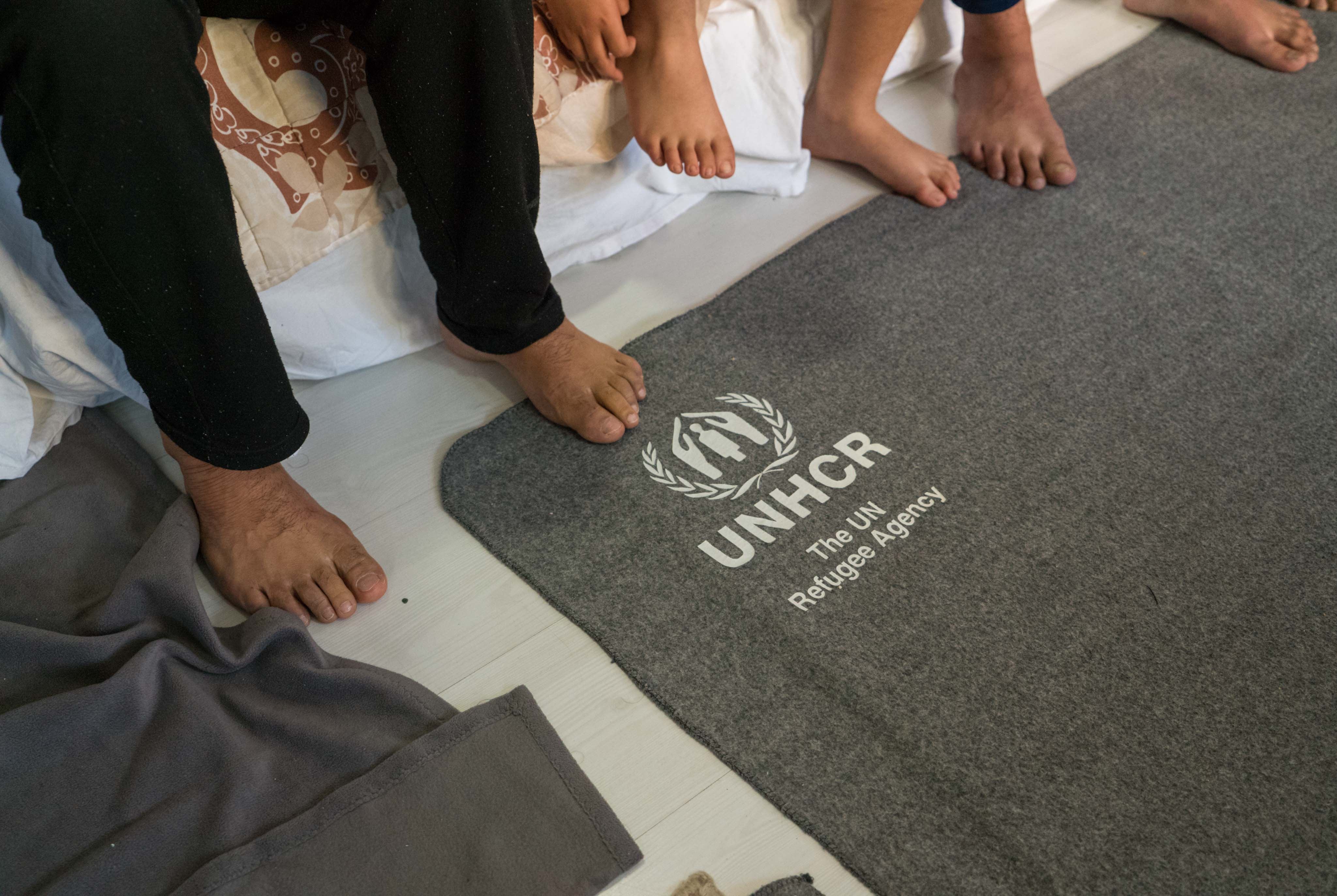 Upstairs, his young family and a dozen others sleep in two flats in close quarters, many on blankets emblazoned with the UNHCR logo draped over the floor.
