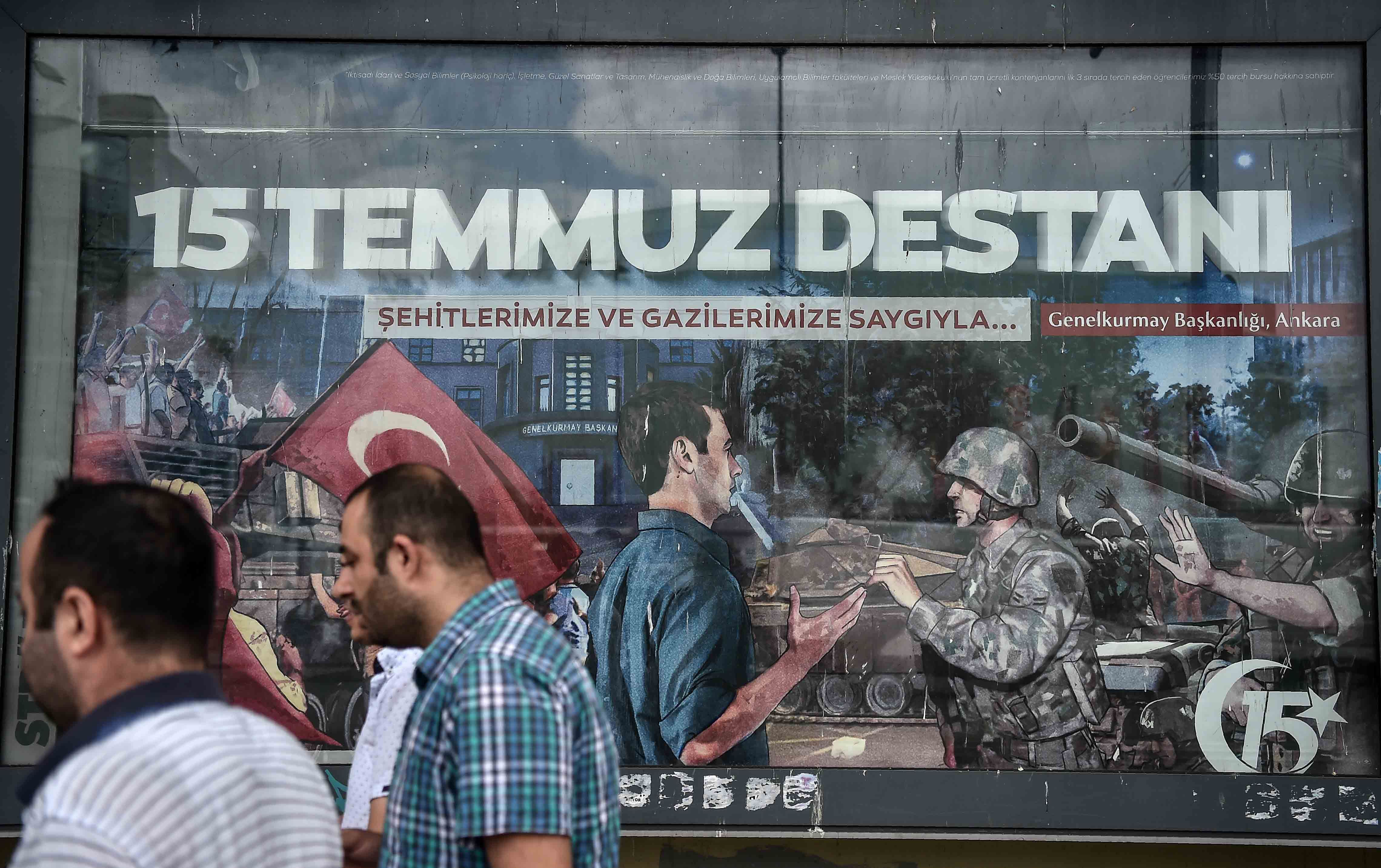 In this file photo taken in Istanbul on July 14, 2017, people walk past a giant billboard marking the anniversary of the attempted coup in Turkey. Photo: Ozan Kose / AFP