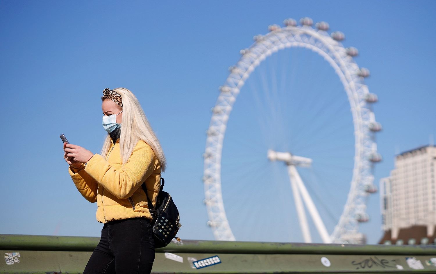 A pedestrian in a mask walks along Westminster Bridge with the London Eye in the background, central London, March 25, 2020. File photo: Tolga Akmen / AFP
