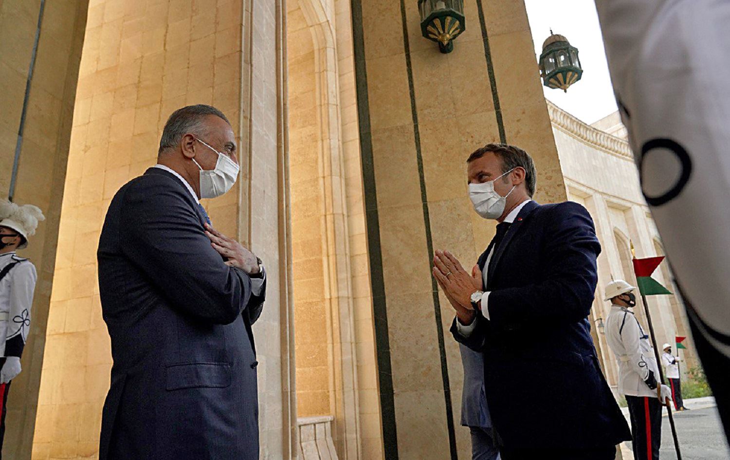 Iraqi Prime Minister Mustafa al-Kadhimi (L) welcomes French President Emmanuel Macron (R) to Baghdad on September 2, 2020. Photo: handout/Iraqi PM's press office/AFP