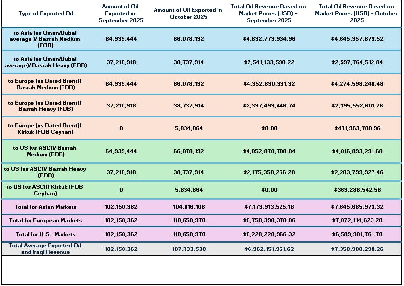 Finally, September 2025 data shows that the total oil exports from Iraq and the Kurdistan Region to Asian and European markets generated $6.96 billion in revenue, with projections indicating a rise to $7.3 billion in October 2025. This increase is partly attributed to higher export volumes from the Kurdistan Region.