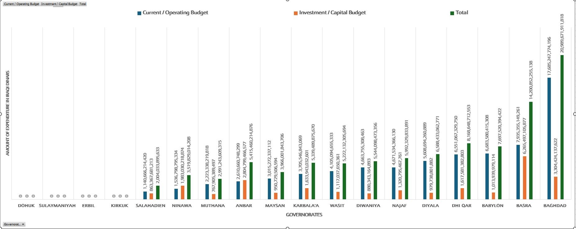 Ministry of Finance spending deviates dramatically from budgets approved by parliament and reveals stark disparities. Kirkuk, for example, received zero operational or investment funds despite producing 310,000 to 320,000 barrels of oil that contribute to Iraq’s economy daily.