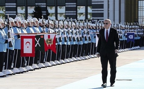 Turkey’s President Recep Tayyip Erdogan reviews an honor guard prior to a welcome ceremony for Ukraine's President Vladimir Zelenskiy, at the Presidential Palace in Ankara, Turkey, August 7, 2019. Photo: Presidential Press Service / pool / AP