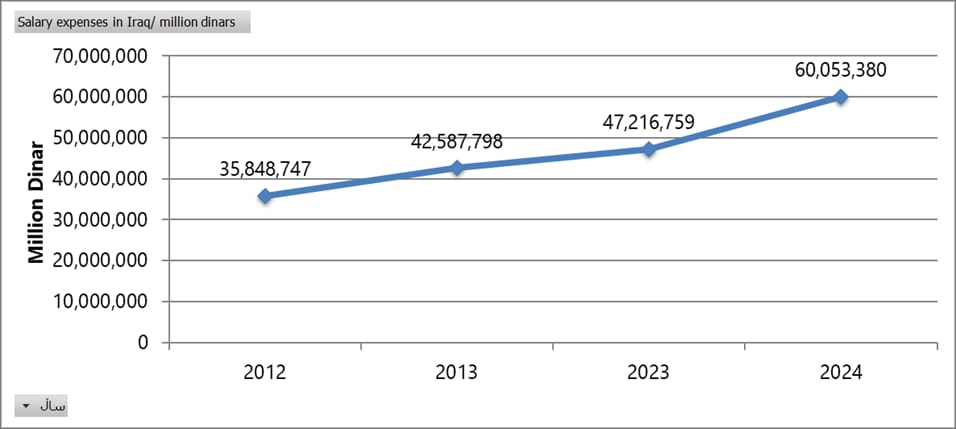 Furthermore, it is predicted that in the coming years, Iraq’s revenue will be just enough to cover salary expenses. According to data from the federal Ministry of Finance, the total salary expenditure for Iraq and the Kurdistan Region in 2012 stood at 35 trillion 848 billion 747 million dinars (approximately $25.6 billion). By 2024, that number had reached 60 trillion 53 billion 380 million dinars (approximately $42.9 billion), despite a decline in Kurdistan Region public employees and the absence of salary payments to them that year.