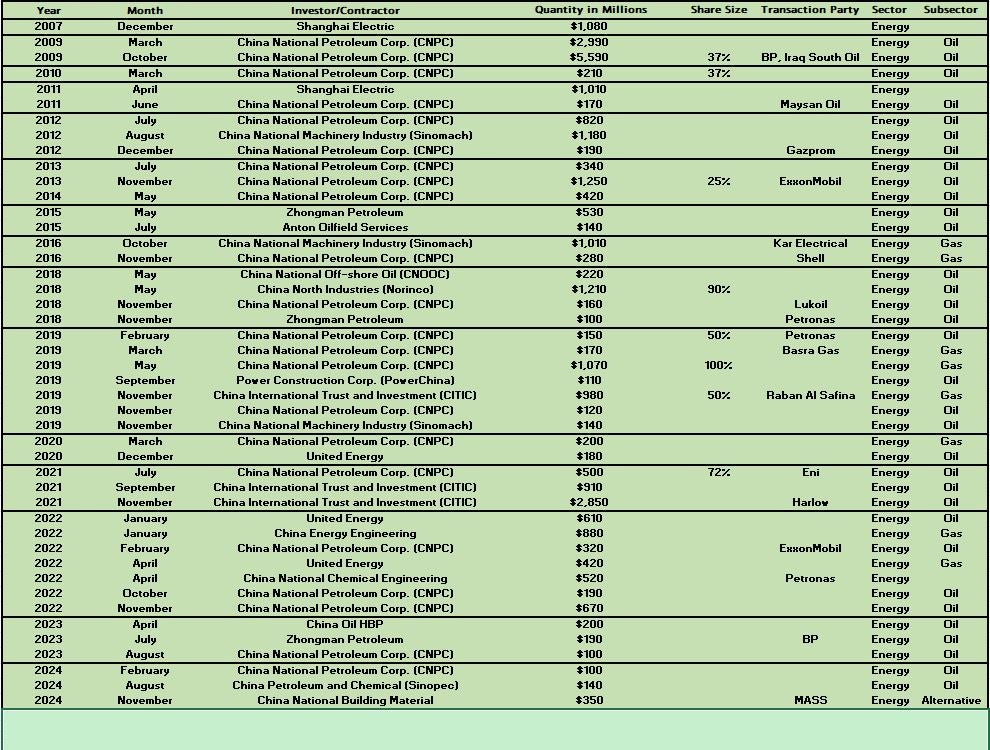 According to available data, China’s total investment in Iraq’s energy, real estate, tourism, and transportation sectors reached $35.4 billion between 2007 and 2024, with over $30 billion directed specifically toward the energy sector. Chinese companies have been active in Iraq for more than two decades; however, the most significant growth has occurred in the oil and gas sector, driven primarily by China’s increasing demand for Iraqi crude oil.