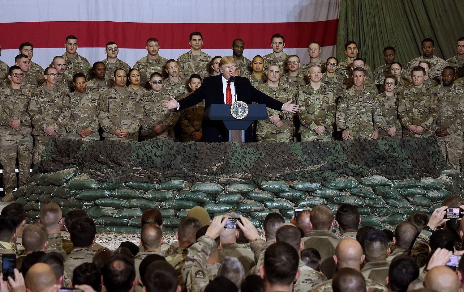 US President Donald Trump speaks to troops during a surprise Thanksgiving Day visit to Bagram Air Field, Afghanistan, November 28, 2019. File photo: Olivier Douliery / AFP