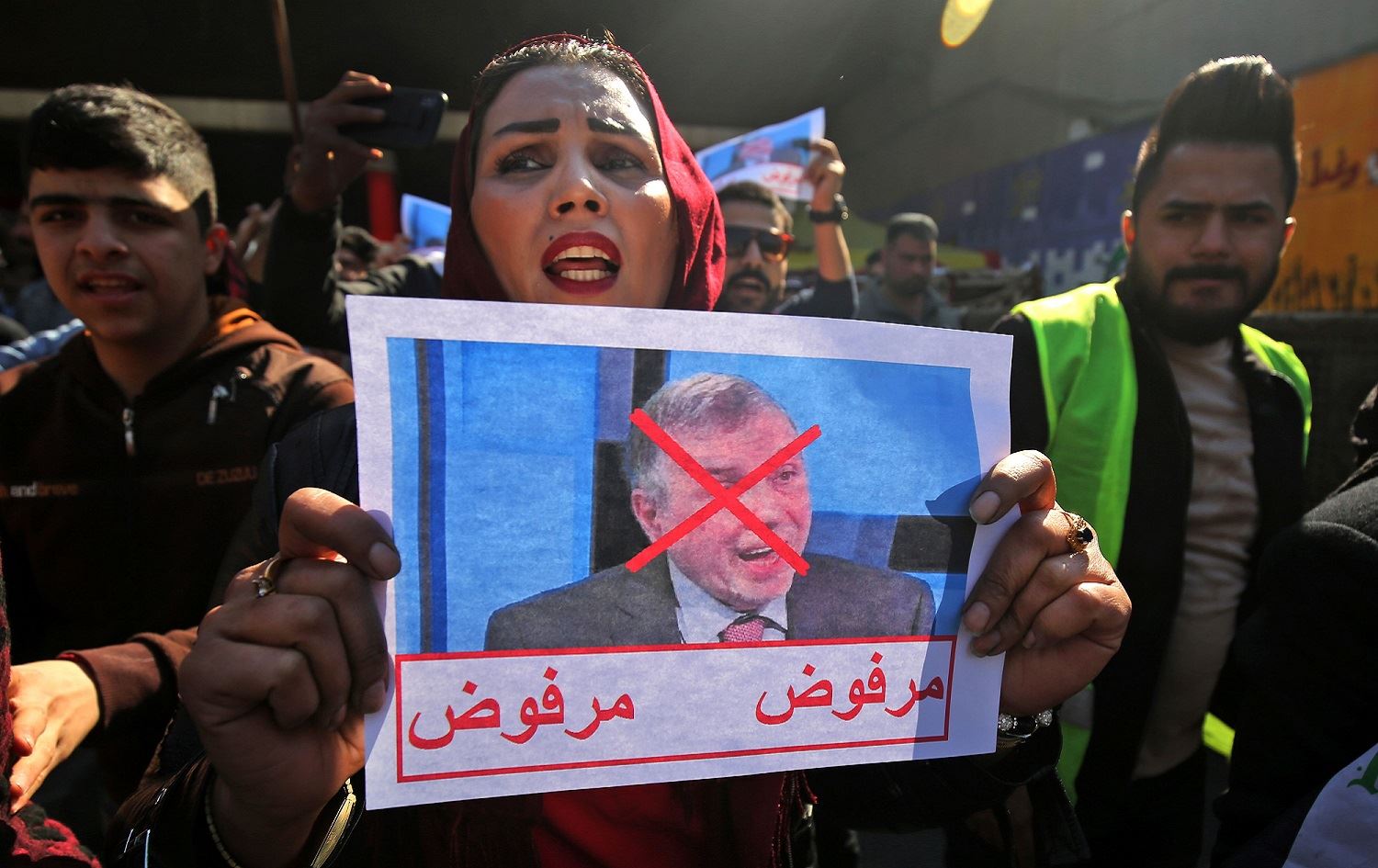 An Iraqi protester holds a picture of Prime Minister-designate Mohammad Tofiq Allawi with the inscription “rejected” during an anti-government demonstration in Baghdad, February 4, 2020. Photo: Ahmad al-Rubaye / AFP