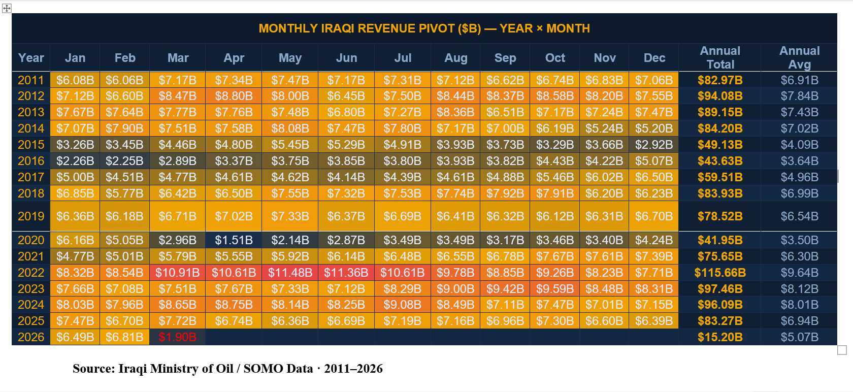 As shown in Iraq’s monthly revenue data from 2011 to 2026, 2026 revenues resemble April 2020 levels. Although daily exports in March this year were only 580,000 barrels, compared to 3.438 million barrels in April 2020, oil prices largely determine revenue.