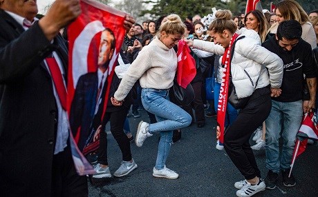 People celebrate outside Istanbul Metropolitan Municipality hall on April 17, 2019 as they wait for the arrival of Turkey's main opposition Republican People's Party (CHP) candidate Ekrem Imamoglu after Turkish election officials officially confirmed his win as Istanbul mayor. Photo: Yasin Akgul/AFP