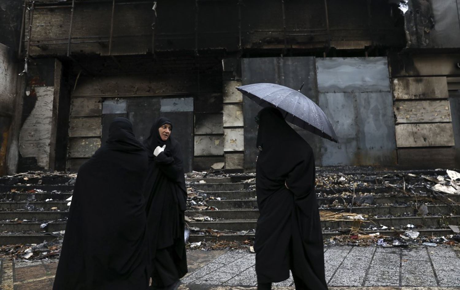 Women walk past a building damaged during recent protests, in Shahriar, Iran, some 40 kilometers southwest of the capital, Tehran, November 20, 2019. Photo: Vahid Salemi/AP