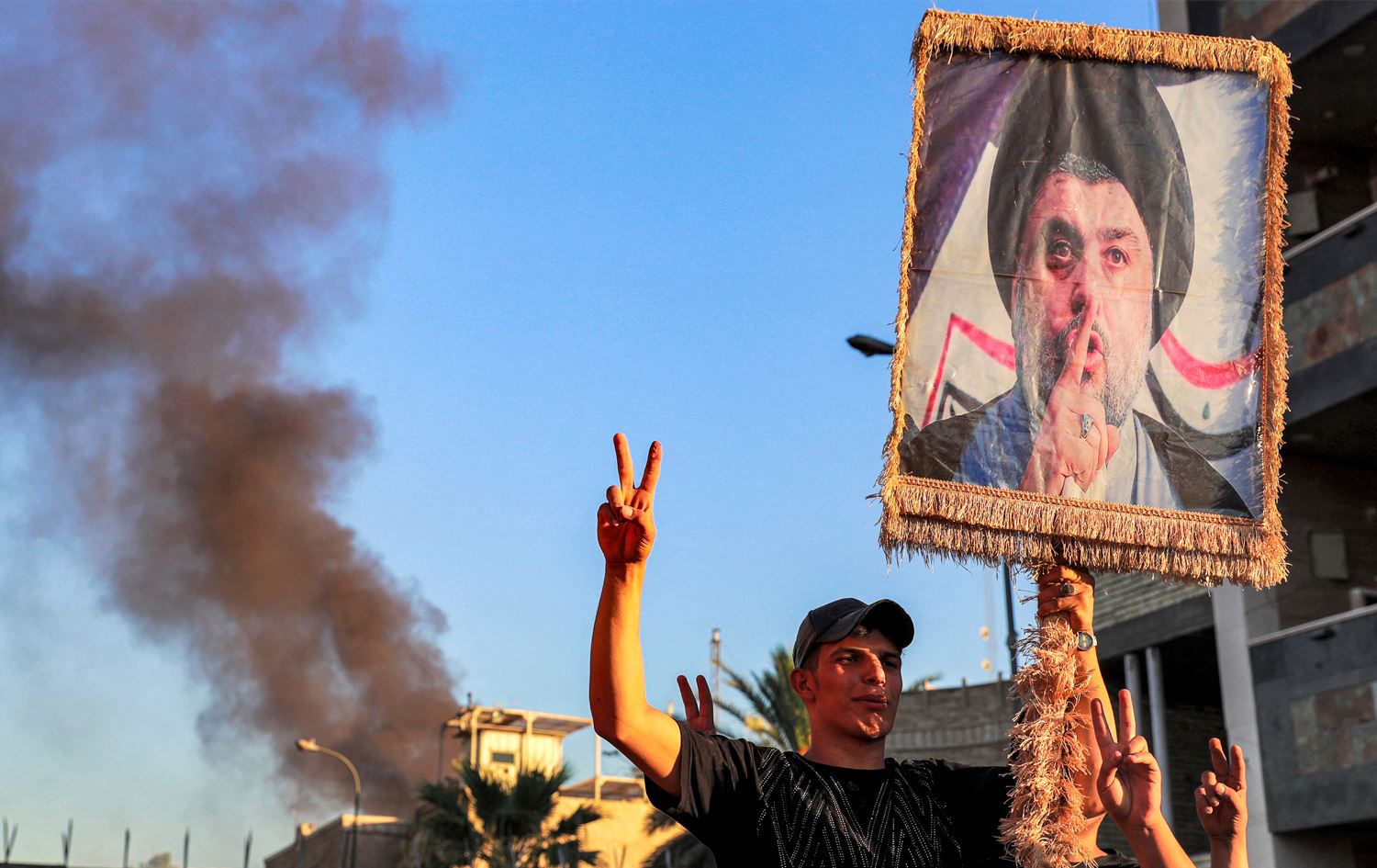 A supporter of Iraqi Shiite cleric Muqtada al-Sadr raises his portrait outside the Swedish embassy in Baghdad after protesters set fire to the building on July 20, 2023. Photo: Ahmad al-Rubaye/AFP